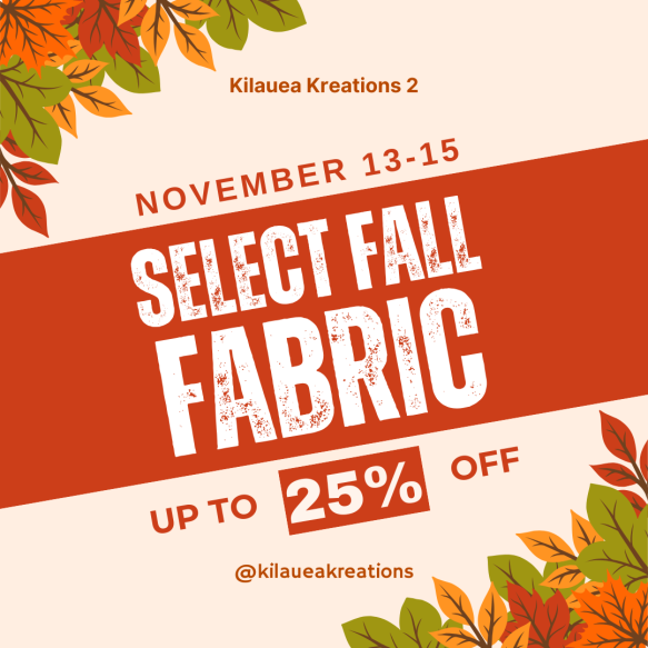 Hello Quilters, Autumn has arrived—and so has a wonderful deal. For today, 11/14, and tomorrow, 11/15 only, enjoy 25% off select fall fabrics in-store and online. 25% Off Select Fall Fabrics